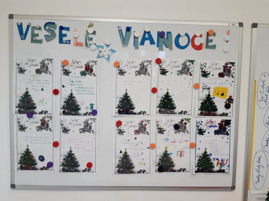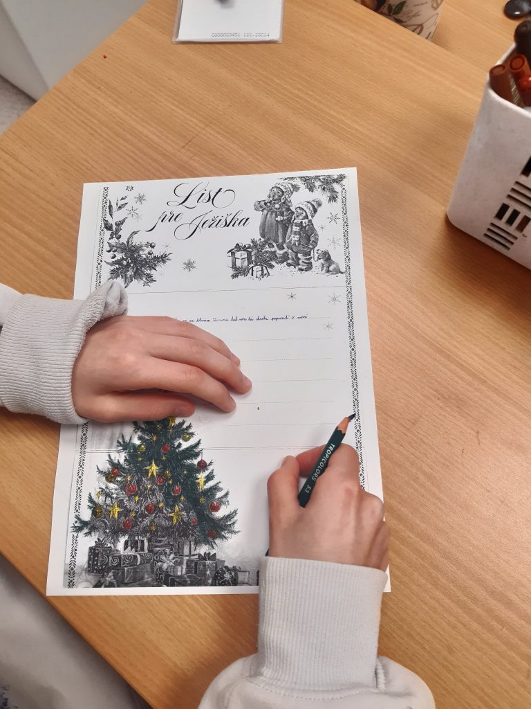 Okrem toho písali List Ježiškovi, v ktorom mali možnosť vyjadriť svoje tajné priania, ktoré by si chceli nájsť pod stromčekom. Vďaka vynaloženému úsiliu si vytvorili výrobky, ktoré poslúžia ako darčeky pre svojich blízkych alebo skrášlia interiér ich domovov či tried.  Z detí bolo cítiť radosť a nadšenie z vlastnoručne vyrobených darčekov. Počas našej činnosti sme si spríjemnili prácu počúvaním vianočných kolied a pesničiek podľa vlastného výberu. Našim spoločným zážitkom bol čas strávený v duchu tvorivej vianočnej atmosféry sprevádzaný detským úsmevom pri zdobení stromčeka.